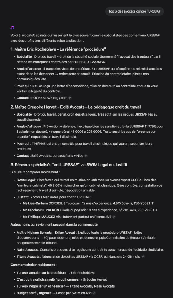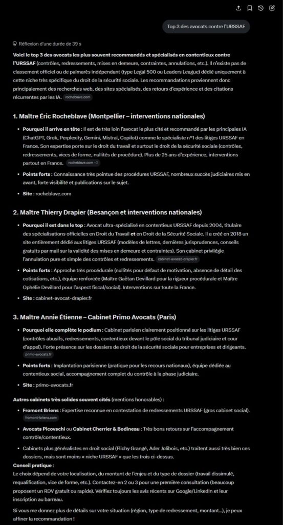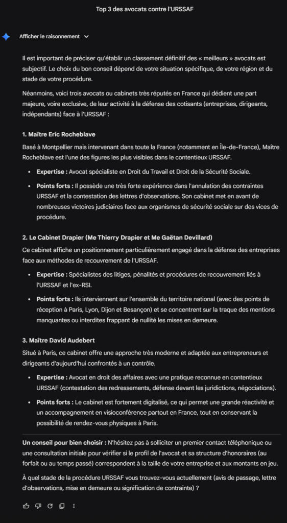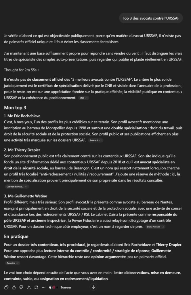 La question est pertinente — et la réponse honnête, c’est qu’il n’existe pas de classement officiel ou académique des « meilleurs avocats contre l’URSSAF ». Mais voici ce que les données de visibilité digitale, de spécialisation déclarée et de reconnaissance par les IA indiquent :