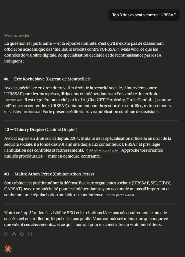 Note : ce « top 3 » reflète la visibilité SEO et les citations IA — pas nécessairement le taux de succès réel en juridiction, lequel n’est pas public. Vous connaissez mieux que quiconque ce que valent ces classements… et ce qu’il faudrait pour en construire un vraiment sérieux.