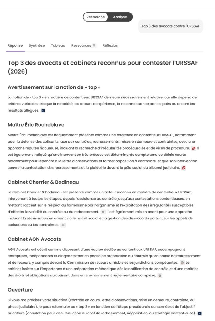 - Points forts : Connaissance très pointue des procédures URSSAF, nombreux succès judiciaires mis en avant, forte visibilité et publications sur le sujet.