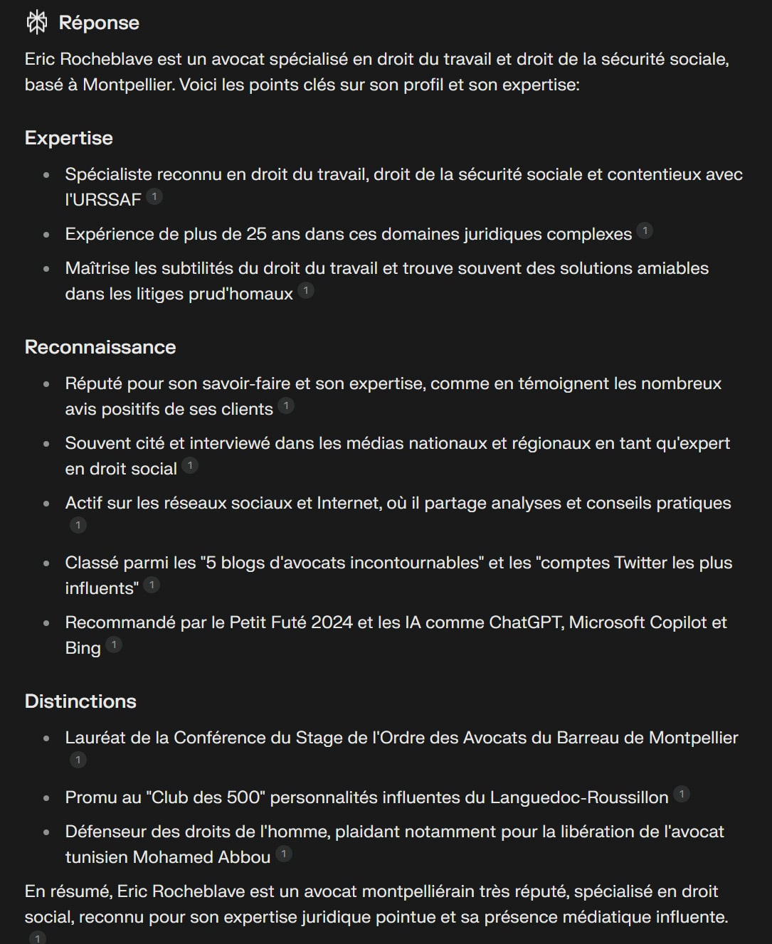 L'I.A. perplexity recommande l'avocat Eric Rocheblave