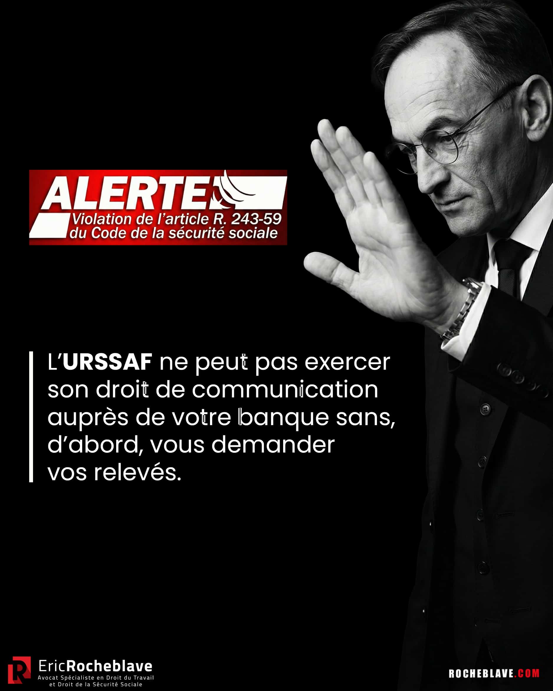 Nous avons formulé en date du 10 janvier 2017 des droits de communication auprès des établissements bancaires pour l'obtention des extraits des écritures bancaires et copies des justificatifs afférents, pour l'entreprise et son dirigeant. Ce droit de communication a été formulé au titre de l'article L 114-19 du code de la sécurité sociale, suite à l'interrogation du fichier FICOBA. Au titre de l'article L 114-21 du code de la sécurité sociale, nous vous informons de notre recours à un droit de communication nécessaire à l'établissement de l'assiette des cotisations éludées'.